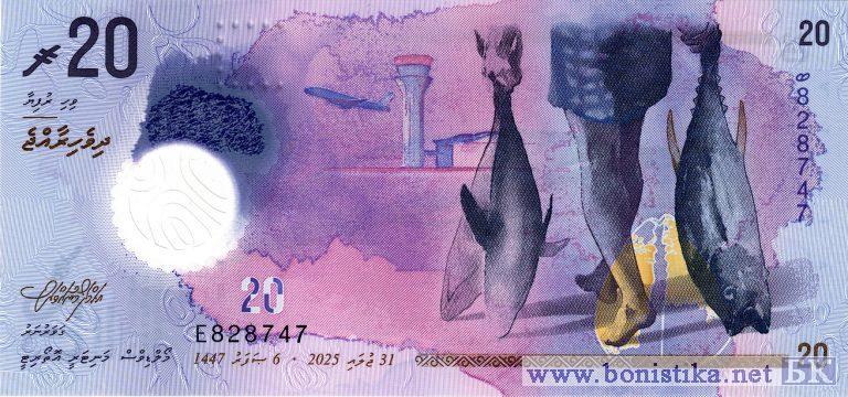 На модернизированной банкноте номиналом 20 руфий образца 2015 года впервые помещен графический символ мальдивской валюты.
