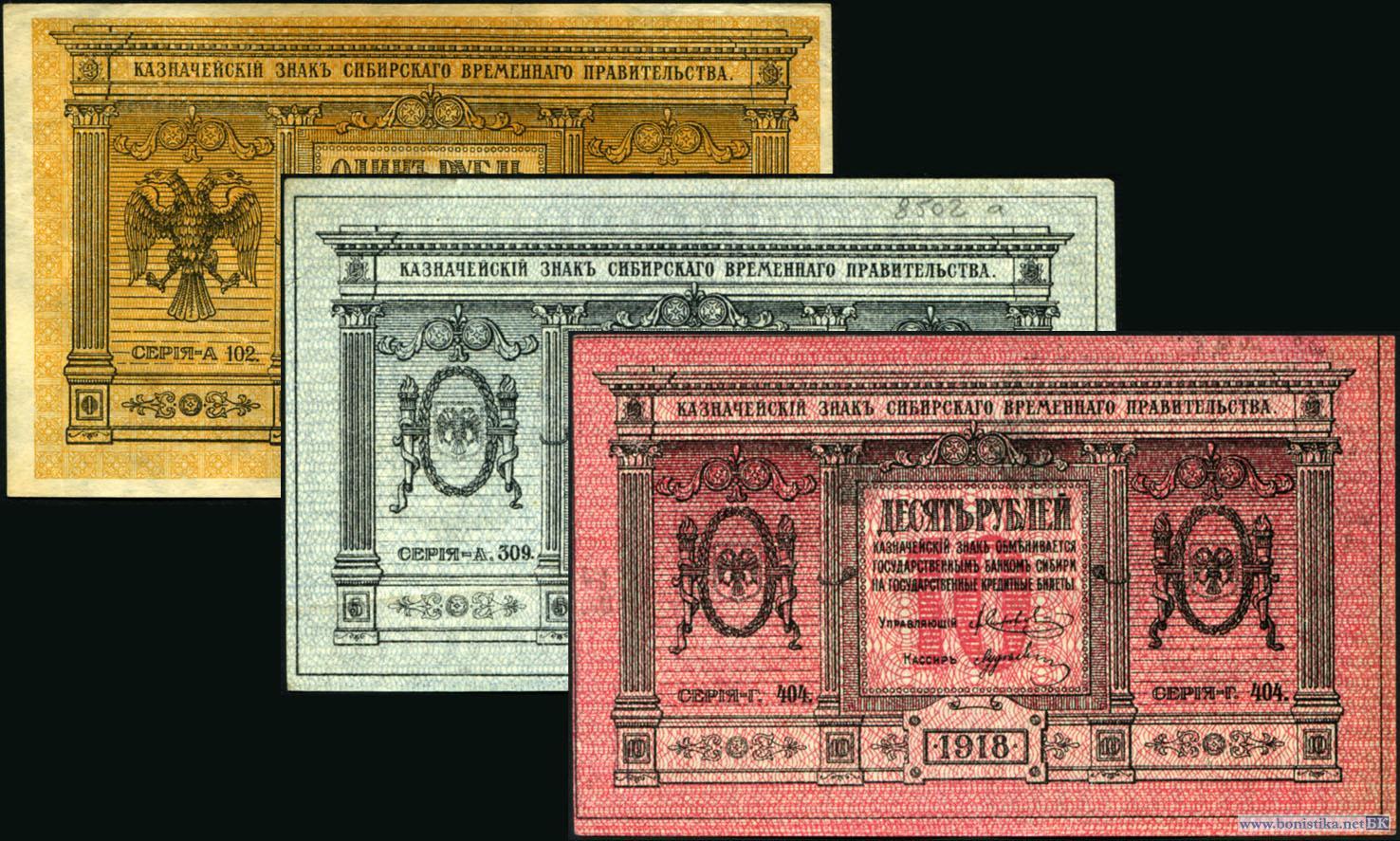 Россия, Гражданская война, 1918, Сибирское временное правительство, 1, 5 и 10 рублей