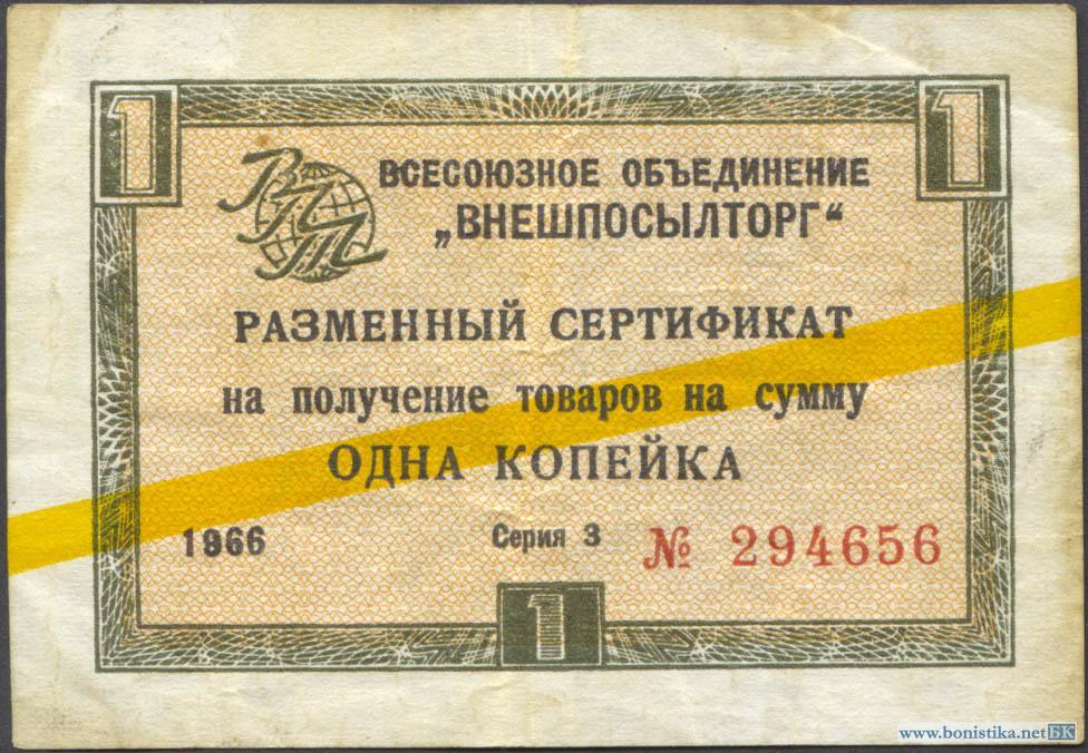 СССР, Заменители валюты, 1966, ВнешПосылТорг, 1 копейка, желтая полоса