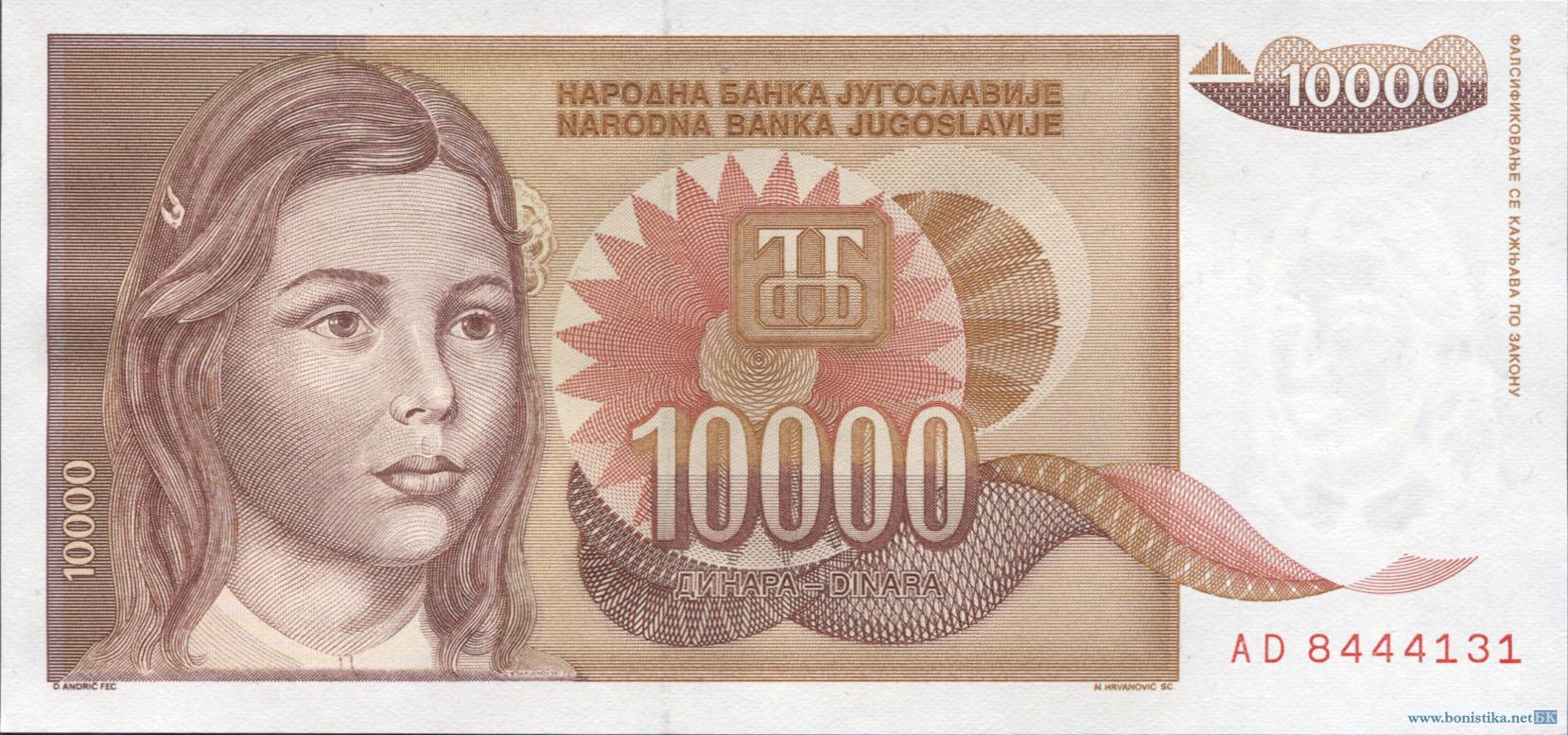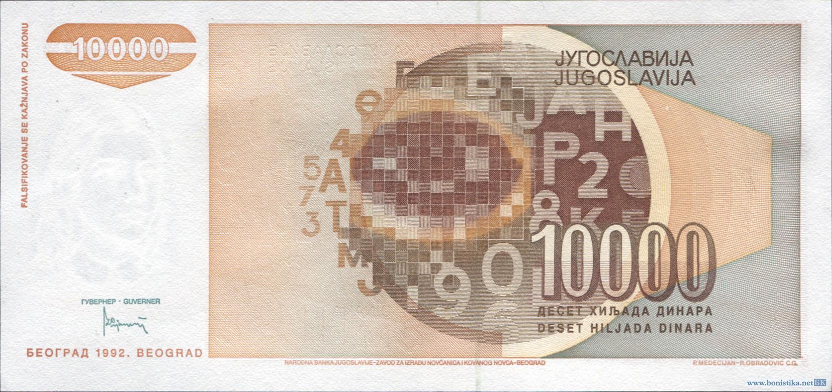 Югославия, 1992, 10000 динаров, точка после даты