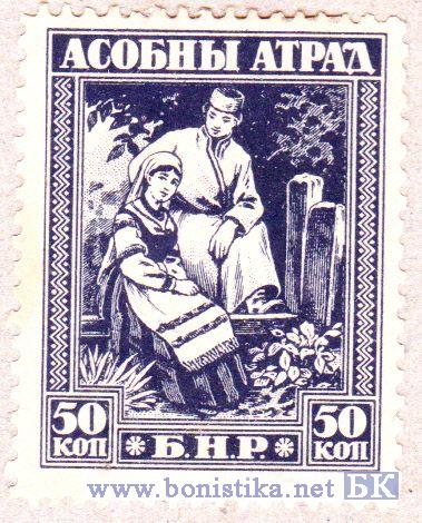 Темно-синяя. Зубцовка 11 1/4*10 1/2, размер по изображению. Размер марки 30,5*39. Марка-бона, одностороняя. Серия включала марки-боны в 5, 10, 15, 50 коп. и 1 руб. с одинаковым изображением но разного цвета (5 к. - зеленая, 10 к. - красная, 15 к. - фиолетовая, 50 к. - синяя, 1 р. - коричневая). Отпечатаны в Латвии.