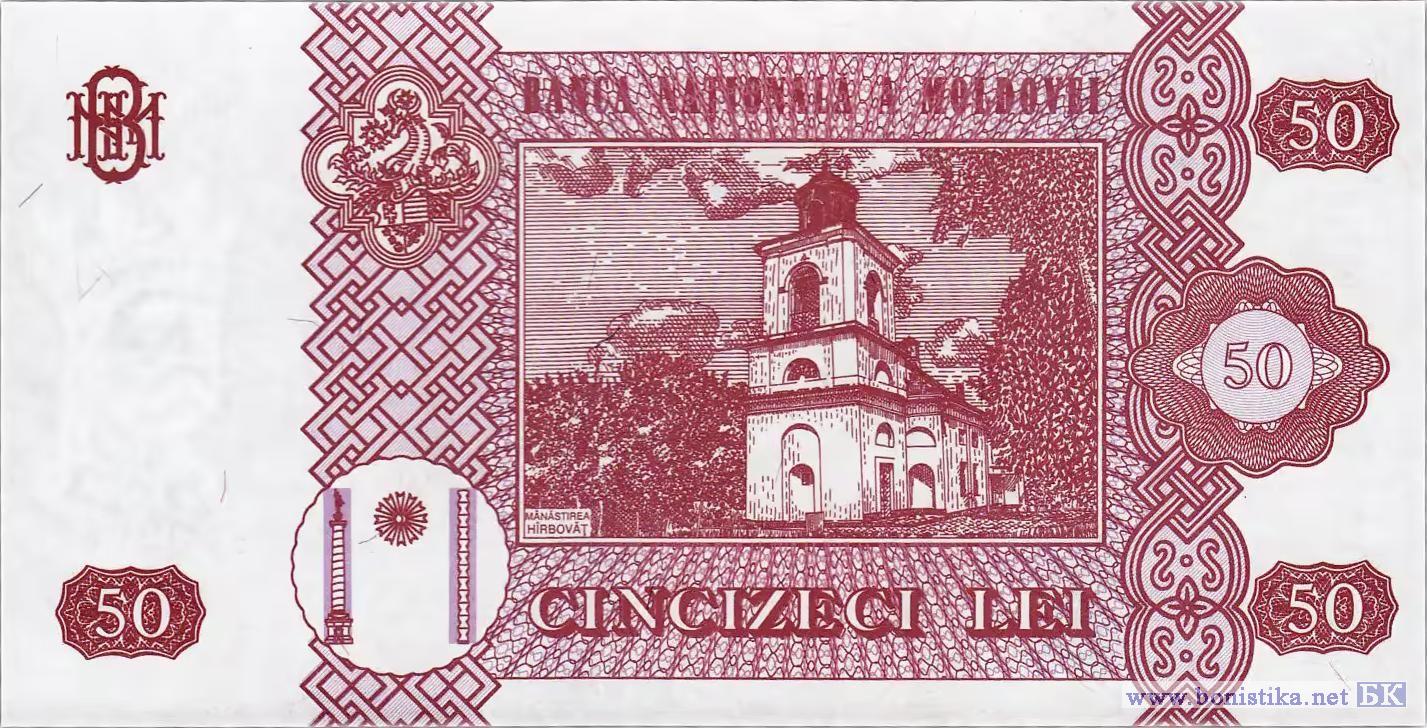 Реверс: Внутри рамы графическое изображение Монастыря Хырбовэц и надпись "MĂNĂSTIREA HÎRBOVĂŢ", номинальная стоимость в цифрах и буквах, два вертикальных декоративных элемента, герб Штефана чел Маре, стилизованное изображение колонны Трояна, Колонны Бесконечности и между ними полумесяц, название эмиссионного банка "BANCA NAŢIONALĂ A MOLDOVEI", художественно оформленная аббревиатура "BNM".