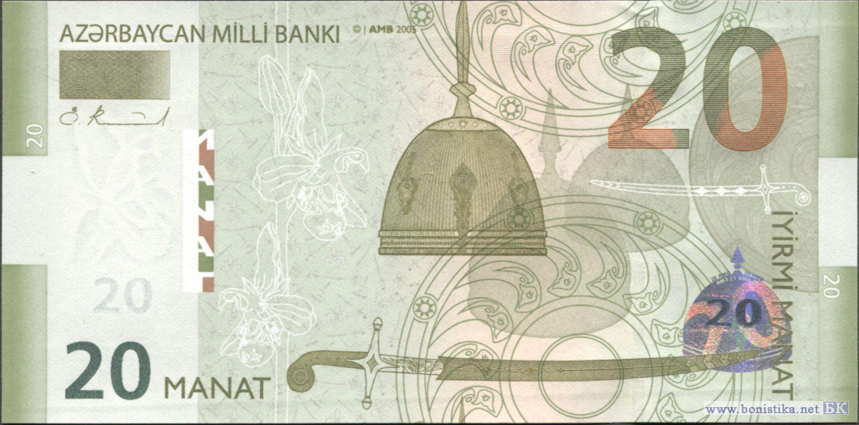 Аверс: изображены символы боевой мощи: кинжал, шлем и щит с типичным восточным орнаментом. Левее, белым цветом изображен символ мира - цветок «Хары Бюльбюль» (дикая орхидея). Произрастает в Нагорном Карабахе. В левом верхнем углу стоит подпись председателя правления Нац банка Азербайджана - Эльмана Рустамова