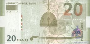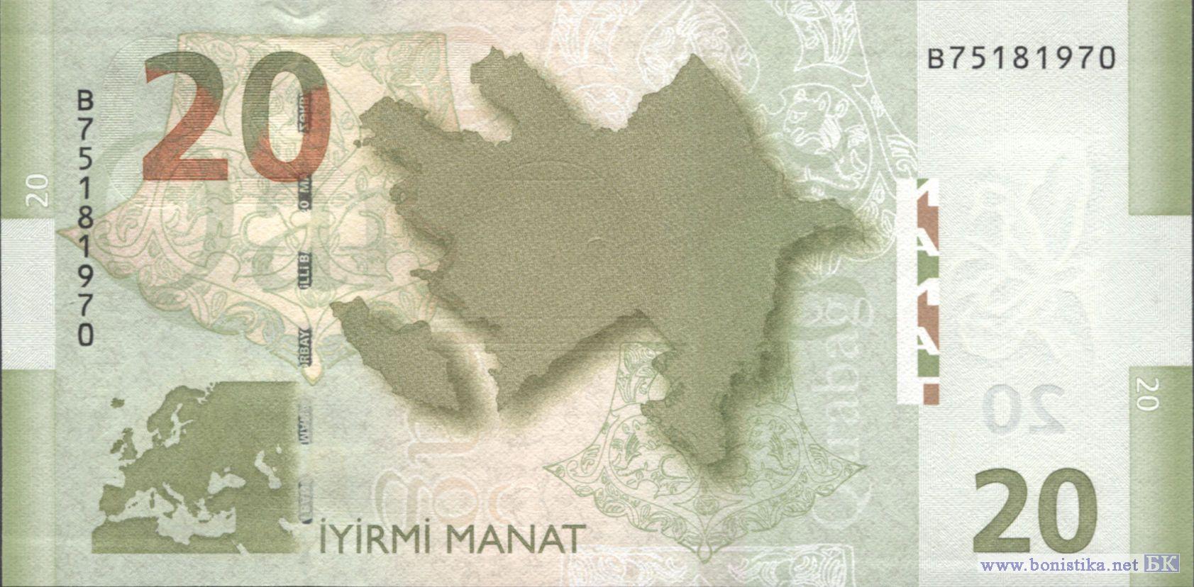 Реверс: на фоне фрагментов национального орнамента и различных написаний слова «КАРАБАХ», дана крупным планом карта Азербайджана, а в левом нижнем углу карта Европы, которая символизирует интеграцию Азербайджана в Европу. В левом верхнем углу - объемная цифра номинала, по размеру меньше, чем на лицевой стороне. В правом нижнем углу - номинал, по цвету схожий с общим цветом банкноты.