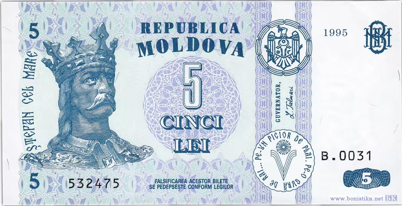 Аверс: Государственный герб Республики Молдова, надпись "REPUBLICA MOLDOVA", портрет Штефана чел Маре, многоцветный национальный орнамент, два вертикальных декоративных элемента, центральный гильош, номинальная стоимость в цифрах и буквах, художественно оформленная аббревиатура "BNM", факсимиле " GUVERNATOR, L. Talmaci", надпись по кругу "PE-UN PICIOR DE PLAI, PE-O GURA DE RAI...", стилизованное изображение литеры "V", год выпуска, номер и серия банкноты, надпись "FALSIFICAREA ACESTOR BILETE SE PEDEPSESTE CONFORM LEGILOR".