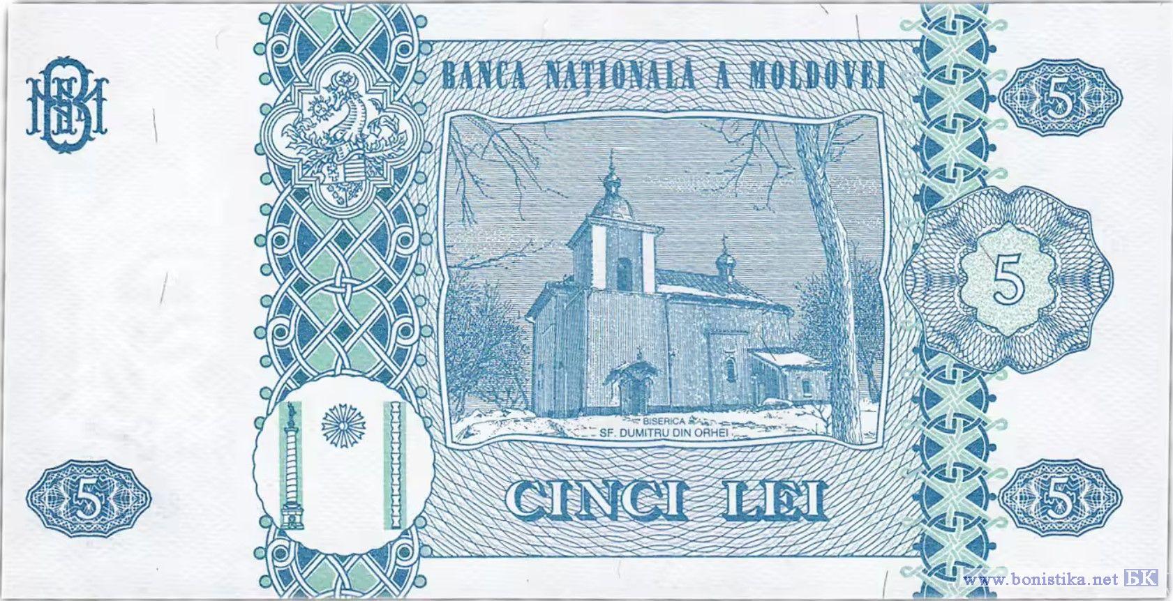 Реверс: Внутри рамы графическое изображение Церкви св. Думитру из Орхей и надпись "BISERICA SF.DUMITRU DIN ORHEI", номинальная стоимость в цифрах и буквах, два вертикальных декоративных элемента, герб Штефана чел Маре, стилизованное изображение колонны Трояна, Колонны Бесконечности и между ними полумесяц, название эмиссионного банка "BANCA NATIONALA A MOLDOVEI", художественно оформленная аббревиатура "BNM".