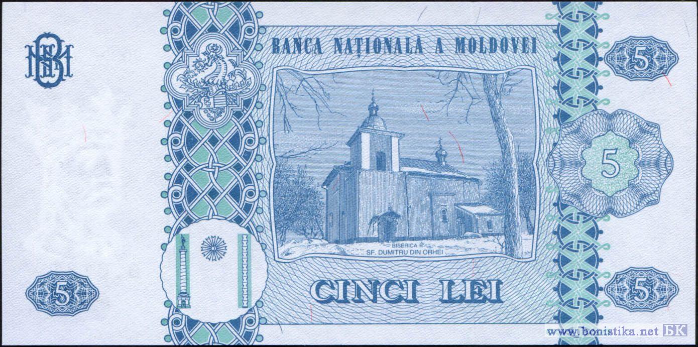 Реверс: Внутри рамы графическое изображение Церкви св. Думитру из Орхей и надпись "BISERICA SF.DUMITRU DIN ORHEI", номинальная стоимость в цифрах и буквах, два вертикальных декоративных элемента, герб Штефана чел Маре, стилизованное изображение колонны Трояна, Колонны Бесконечности и между ними полумесяц, название эмиссионного банка "BANCA NATIONALA A MOLDOVEI", художественно оформленная аббревиатура "BNM".