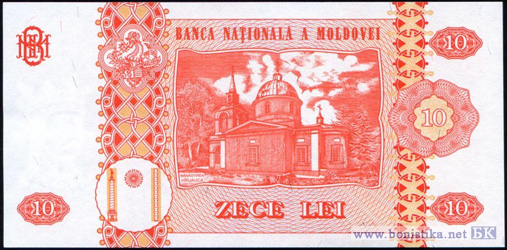Реверс: Внутри рамы графическое изображение Монастыря Хыржаука и надпись "MĂNĂSTIREA HÎRJAUCA", номинальная стоимость в цифрах и буквах, два вертикальных декоративных элемента, герб Штефана чел Маре, стилизованное изображение колонны Трояна, Колонны Бесконечности и между ними полумесяц, название эмиссионного банка "BANCA NAŢIONALĂ A MOLDOVEI", художественно оформленная аббревиатура "BNM".