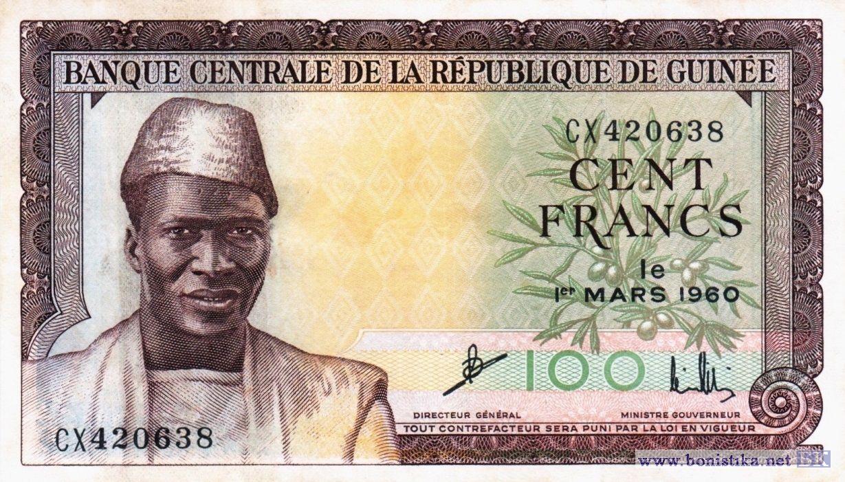 Первый президент, писатель Ахмед Секу Туре, ветвь с листьями и плодами оливкового дерева, или маслины европейской (Olea europaea) – вечнозелёного субтропического дерева семейства маслиновых. Горы, сборщики урожая на плантации ананасов.