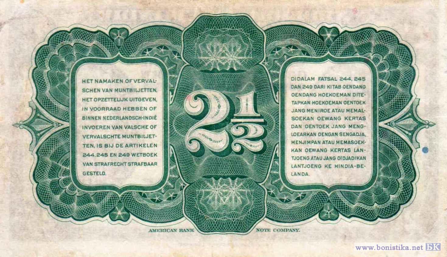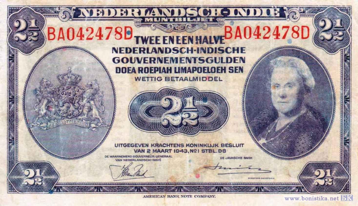 Вариант подписей: Hubertus Johannes van Mook - R.E. Smits. Серийные номера 2-го типа: две литеры, шесть цифр и одна литера.