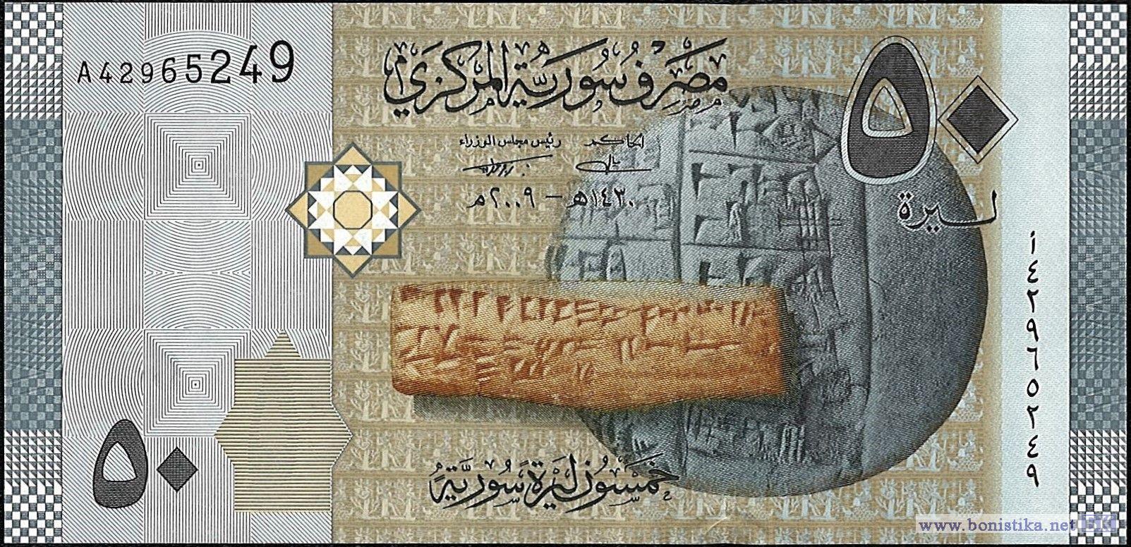 Выпуск 2010 года. Глиняные клинописные таблички из архива Эблы. Здание библиотеки и статуя президента Хафеза аль-Асада в г. Дамаск.