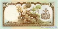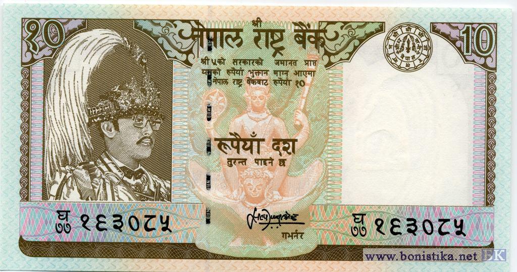 Вариант подписи: Hari Shankar Tripathy. Принтер: (B A Banknote International, Canada). Король Бирендра Бир Бикрам Шах Дев, скульптура Чангу Нараян (воплощение бога Вишну). Гарны или винторогие антилопы (Antilope cervicapra) – млекопитающие из семейства полорогих.