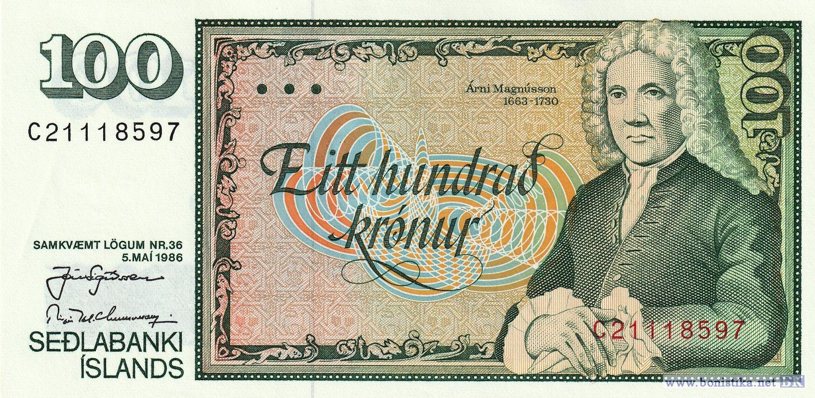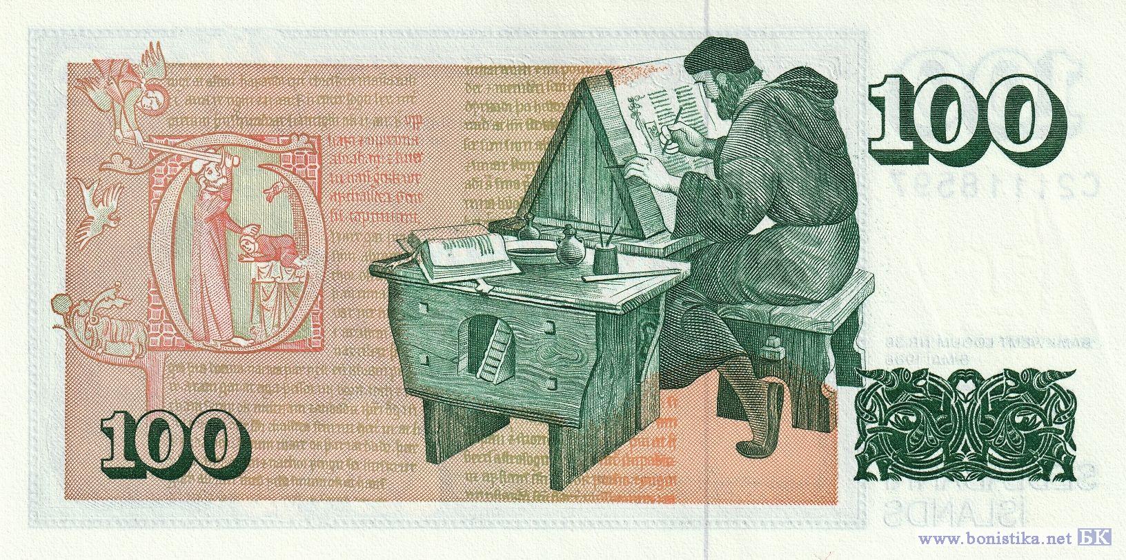 Выпуск 1994 года. Вариант подписей №52: J. Sigurthsson - B.I. Gunnarsson. Учёный, историк, профессор Копенгагенского университета Аурни Магнуссон. Фрагмент страницы рукописной книги, монах переписывающий книгу.