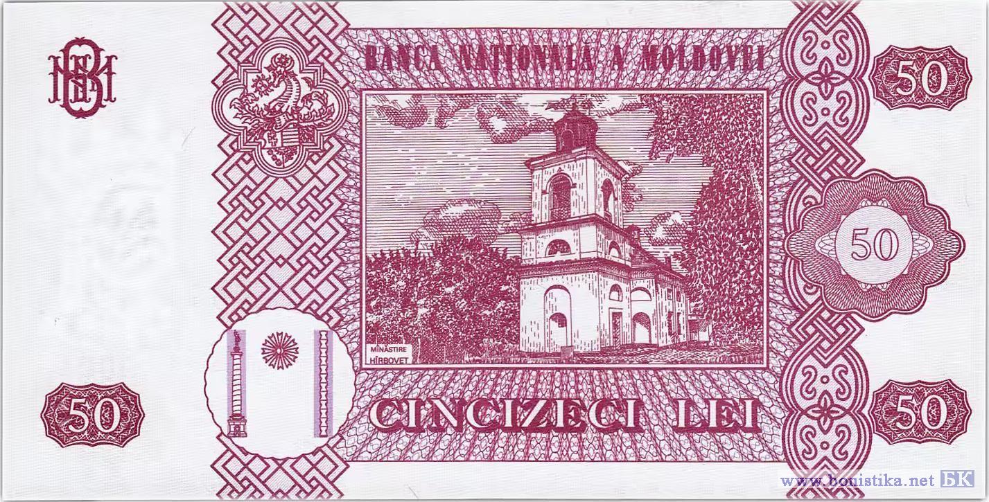 Преобладающие цвета, лицевая и оборотная сторона: красно-фиолетовый. Отпечатана на специальной бумаге, содержащей водяной знак изображающий портрет Штефана чел Маре и внедренную вертикальную металлизированную нить. Аверс: Государственный герб Республики Молдова, надпись "REPUBLICA MOLDOVA", портрет Штефана чел Маре, многоцветный национальный орнамент, два вертикальных декоративных элемента, центральный гильош, номинальная стоимость в цифрах и буквах, художественно оформленная аббревиатура "BNM", факсимиле "GUVERNATOR, L. Talmaci", надпись по кругу "PE-UN PICIOR DE PLAI, PE-O GURA DE RAI...", стилизованное изображение литеры "V", год выпуска, номер и серия банкноты, надпись "FALSIFICAREA ACESTOR BILETE SE PEDEPSEŞTE CONFORM LEGILOR". Реверс: Внутри рамы графическое изображение Монастыря Хырбовэц и надпись "MÎNĂSTIRE HÎRBOVEŢ" (с ошибками), номинальная стоимость в цифрах и буквах, два вертикальных декоративных элемента, герб Штефана чел Маре, стилизованное изображение колонны Трояна, Колонны Бесконечности и между ними полумесяц, название эмиссионного банка "BANCA NAŢIONALĂ A MOLDOVEI", художественно оформленная аббревиатура "BNM". Защитные элементы: темный водяной знак, изображающий портрет Штефана чел Маре направленный к центру, просматриваемый на просвет; металлизированная защитная нить, внедренная между портретом Штефана чел Маре и центральным гильошом, просматриваемой на просвет; при рассмотрении банкноты на просвет: должны совпадать внешний контур стилизованных изображений солнца на лицевой стороне и полумесяца на оборотной стороне, а также круг солнца с кругом, в который вписан полумесяц. Буква "V" на лицевой стороне и изображение Колонны Трояна и Колонны Бесконечности на оборотной стороне при совмещении должны образовать силуэт буквы "M" (Moldova).