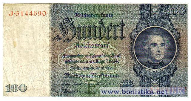 R176a. Выпуск с середины 1936г. Наличие объёмного штампа на купонном поле, комбинация буквы в номере под свастикой, в банковском штампе орёл и легенда разных оттенков синего.