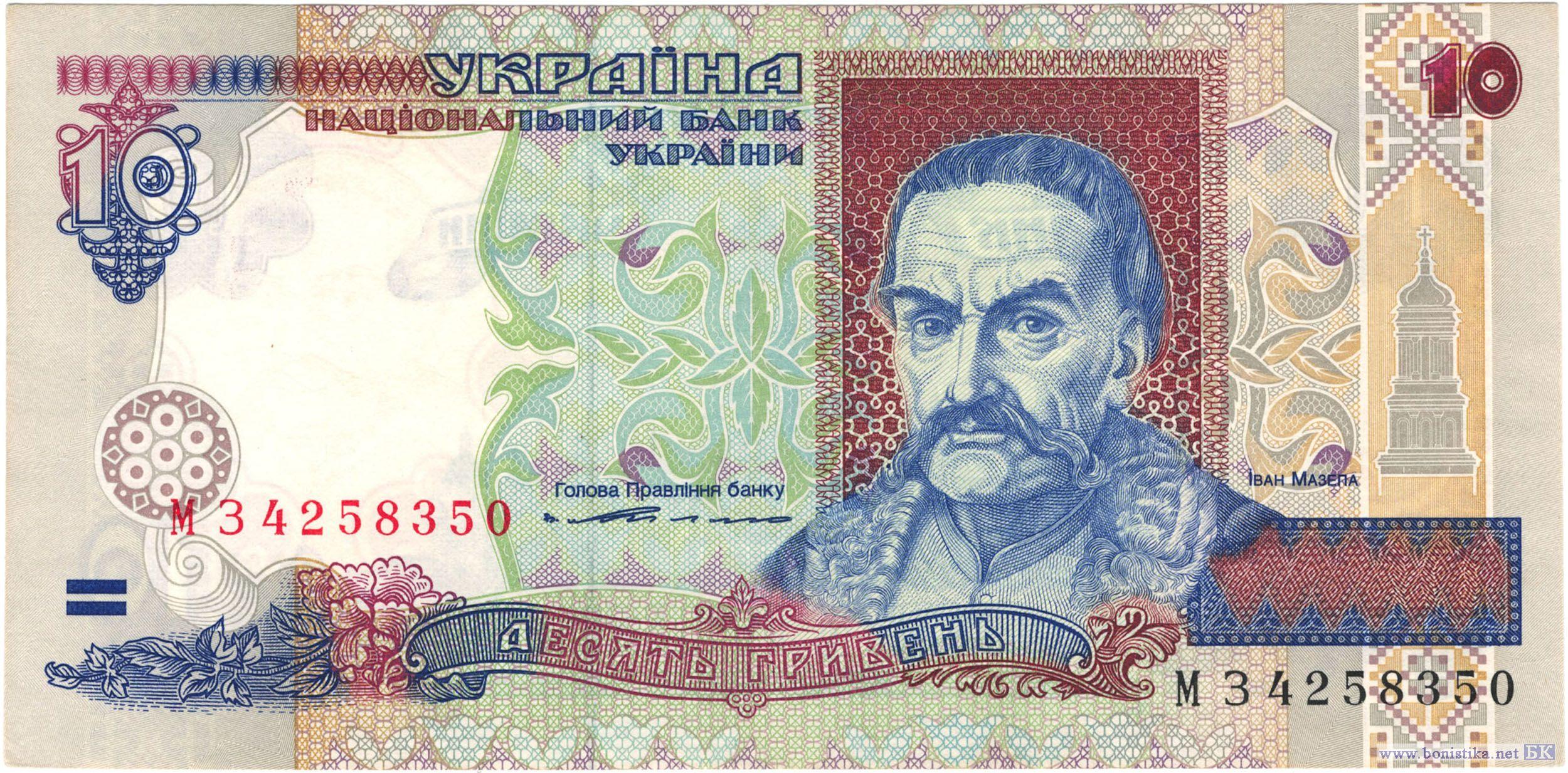 Украинский нумератор. Банкнота выпущена в обращение в 1997 году. Государственный и политический деятель, гетман Войска Запорожского Иван Степанович Мазепа (Мазепа-Колединский). Монастырь Киево-Печерская Лавра в г. Киеве.