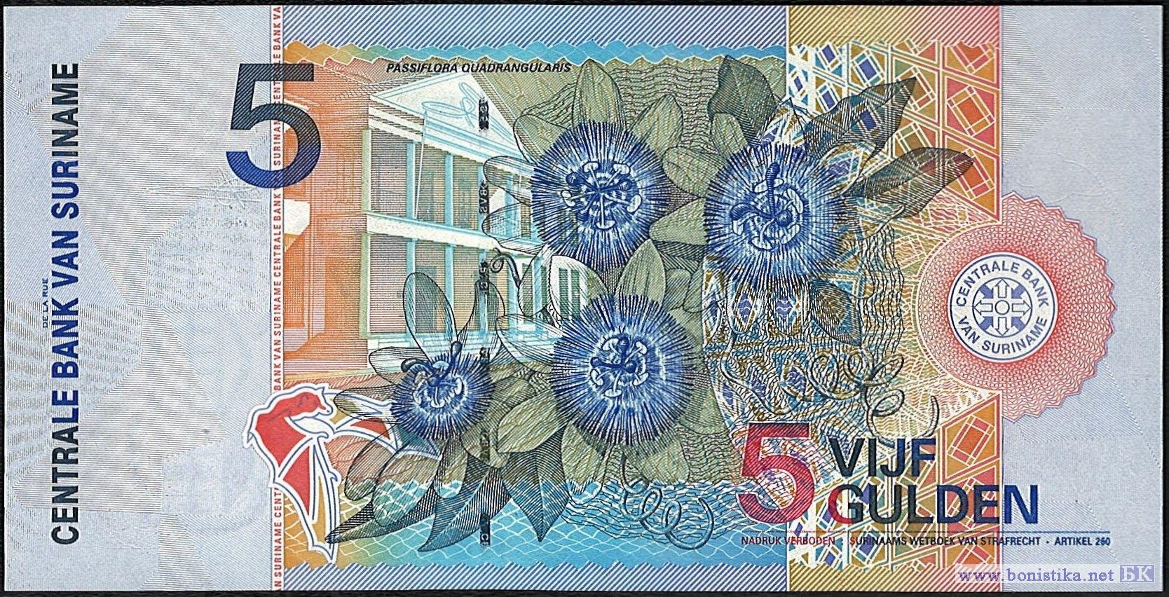 Красношейный королевский дятел (Campephilus rubricollis) – птица семейства дятловых. Здание центрального банка в г. Парамарибо, цветки гигантской гранадиллы или страстоцвета четырёхгранного (Passiflora quadrangularis) – древовидной лианы семейства страстоцветных.