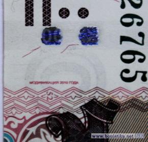 На лицевой стороне модифицированной банкноты, в нижней части левого купонного поля слева от основного изображения, находится текст «МОДИФИКАЦИЯ 2010 ГОДА».