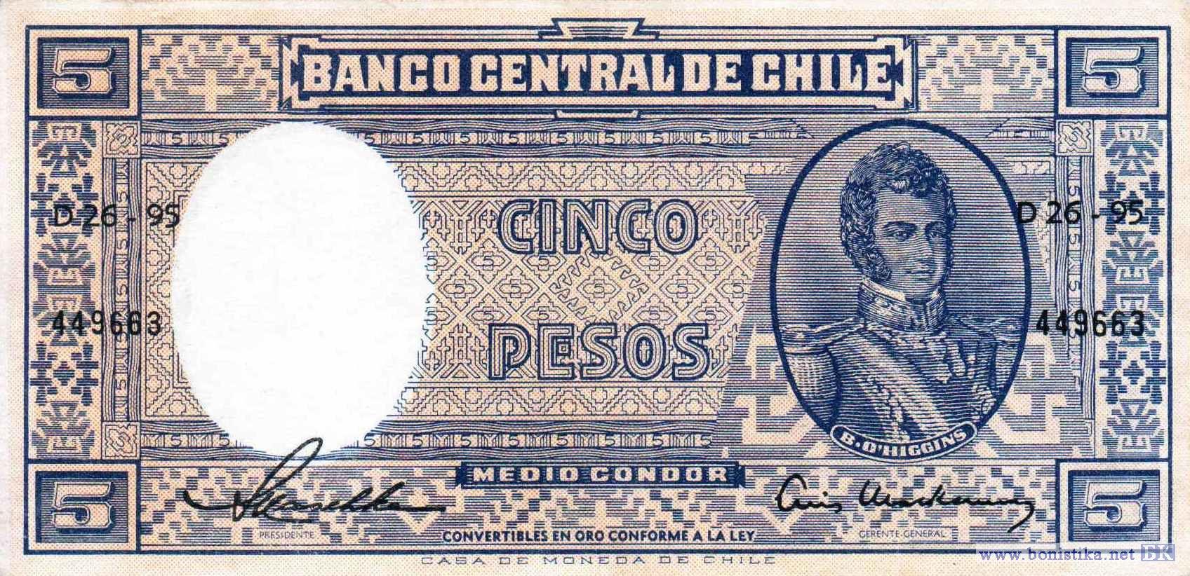 Национальный герой, революционер, руководитель борьбы за независимость, глава правительства, подписавший декларацию независимости, Великий маршал Перу Бернардо О`Хиггинс Рикельме. Эмблема Центрального банка.