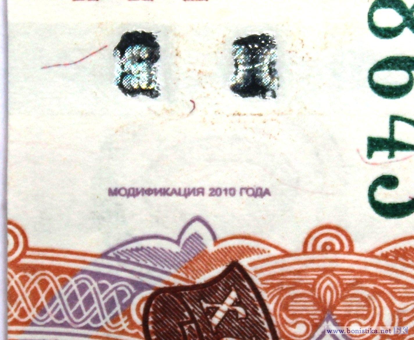 На лицевой стороне модифицированной банкноты, в нижней части левого купонного поля слева от основного изображения, находится текст "МОДИФИКАЦИЯ 2010 ГОДА".