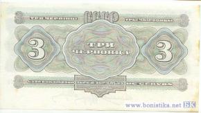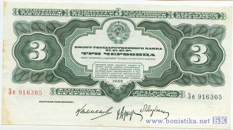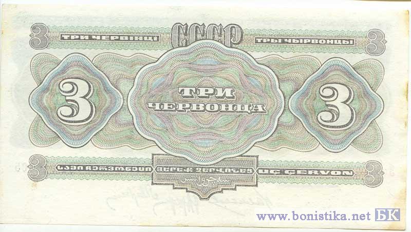 Выпущена была на заменну 3 червонцам 1924 года, один вариант подписей, серии АА - Аа, имела хождение до реформы 1947 года.