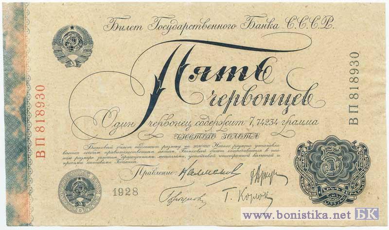 5 Червонцев (4 подписи), 1928