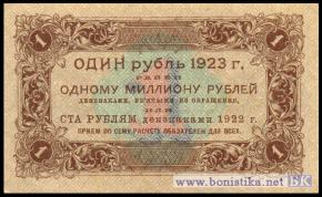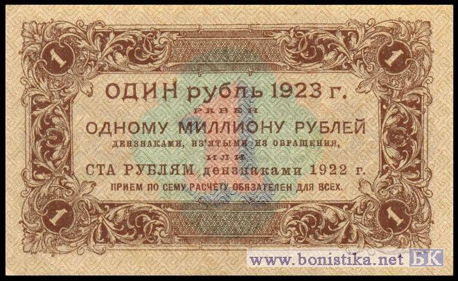 1 рубль 1923 года первого выпуска (на ОС надпись выполнена в 7 строк:"Один рубль 1923г.\ равен \одному миллиону рублей\ дензнаками,изъятыми из обращения\ или \ста рублям дензнаками 1922г.\ прием по сему расчету обязателен для всех\)