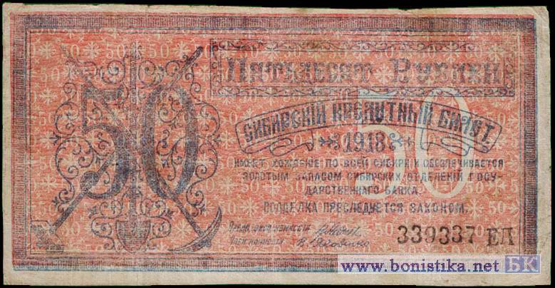 50 рублей 1918 года Правительство центросибири, Сибирский кредитный билет, Без регистрационного штемпеля.