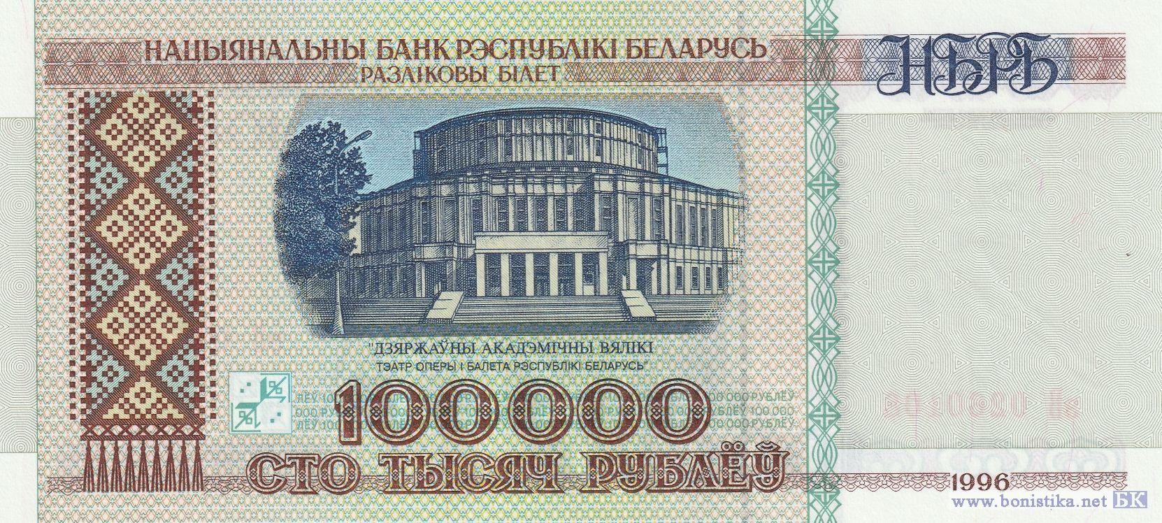 В обращении с 17 октября 1996 по 1 января 2001 г. Серии первого выпуска (тип 1) - вА,вБ,вГ,вЕ,вЗ,вУ,вФ,вХ,вЧ,вЭ,вЯ. Надпись на защитной полосе - "РБ 100000". Ко второму 1997 года выпуску (тип 2) - относятся серии дЕ,дУ,дФ,дХ,дЧ,дЭ. Надпись на защитной полосе - "РБ 100000", но размер шрифта немного мельче и расстояние между чередующимися "РБ 100000" больше.