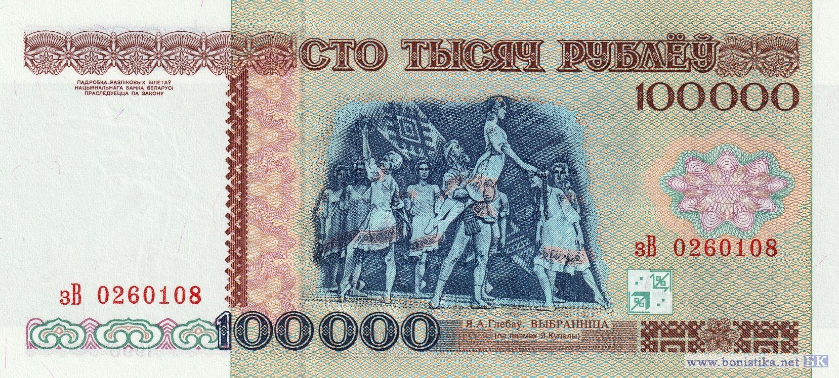 100000 рублей 1996 (Выпуск 1998). На защитной полосе надпись "НБРБ". Серии этого типа: зА,зБ,зВ.