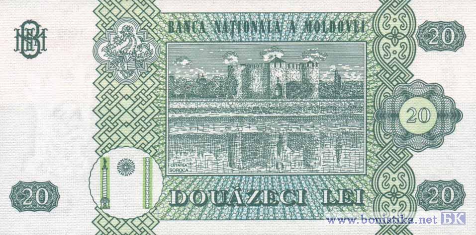 Реверс: Внутри рамы графическое изображение Монастыря Хырбовэц и надпись "MĂNĂSTIREA HÎRBOVĂŢ", номинальная стоимость в цифрах и буквах, два вертикальных декоративных элемента, герб Штефана чел Маре, стилизованное изображение колонны Трояна, Колонны Бесконечности и между ними полумесяц, название эмиссионного банка "BANCA NAŢIONALĂ A MOLDOVEI", художественно оформленная аббревиатура "BNM".