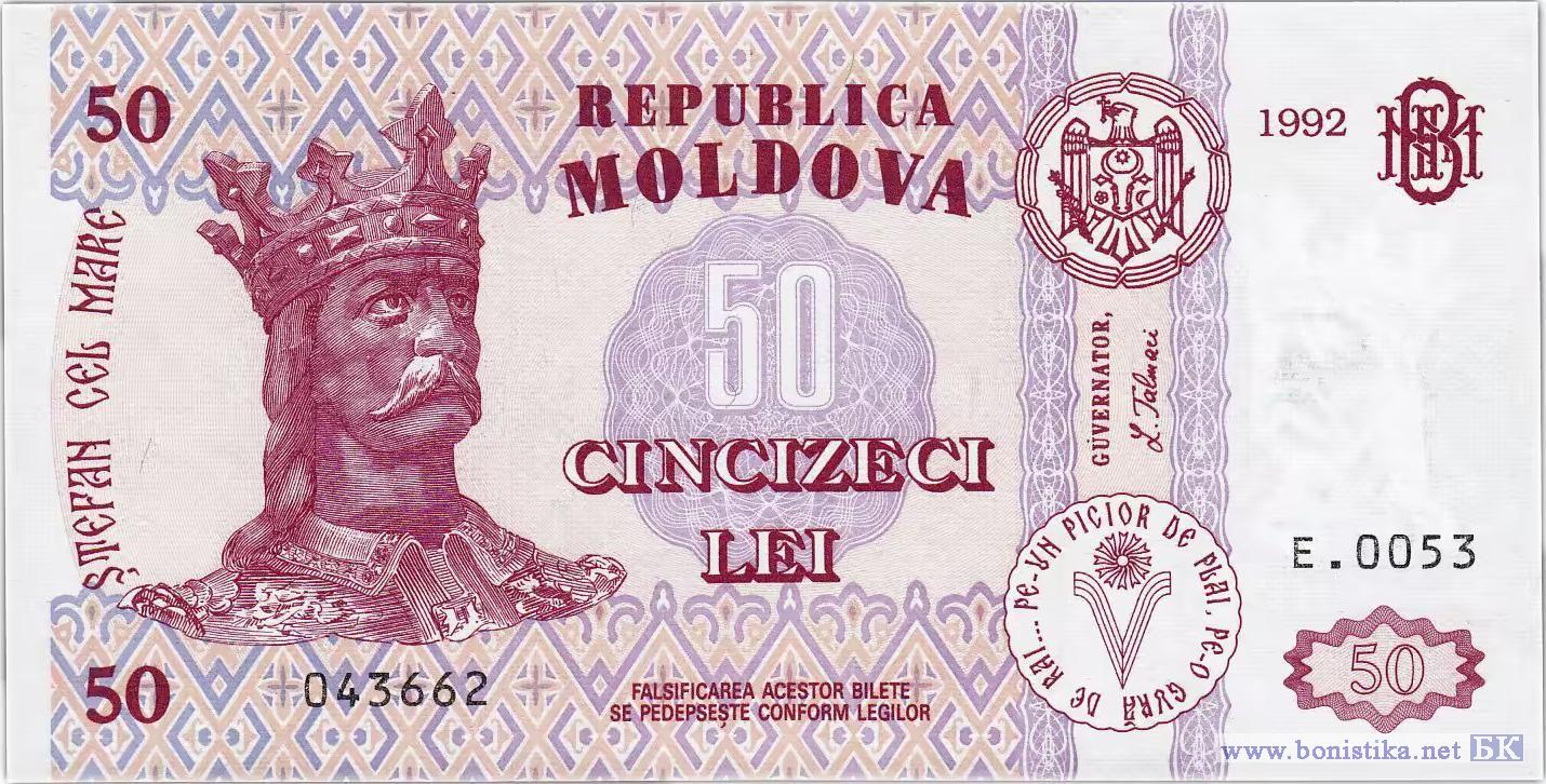 Отпечатана на специальной бумаге, содержащей водяной знак изображающий портрет Штефана чел Маре и внедренную вертикальную металлизированную нить.