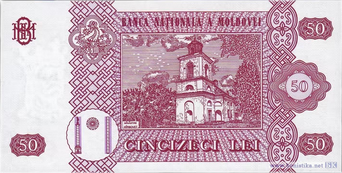 Реверс: Внутри рамы графическое изображение Монастыря Хырбовэц и надпись "MÎNĂSTIRE HÎRBOVEŢ" (с ошибками), номинальная стоимость в цифрах и буквах, два вертикальных декоративных элемента, герб Штефана чел Маре, стилизованное изображение колонны Трояна, Колонны Бесконечности и между ними полумесяц, название эмиссионного банка "BANCA NAŢIONALĂ A MOLDOVEI", художественно оформленная аббревиатура "BNM".