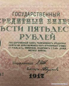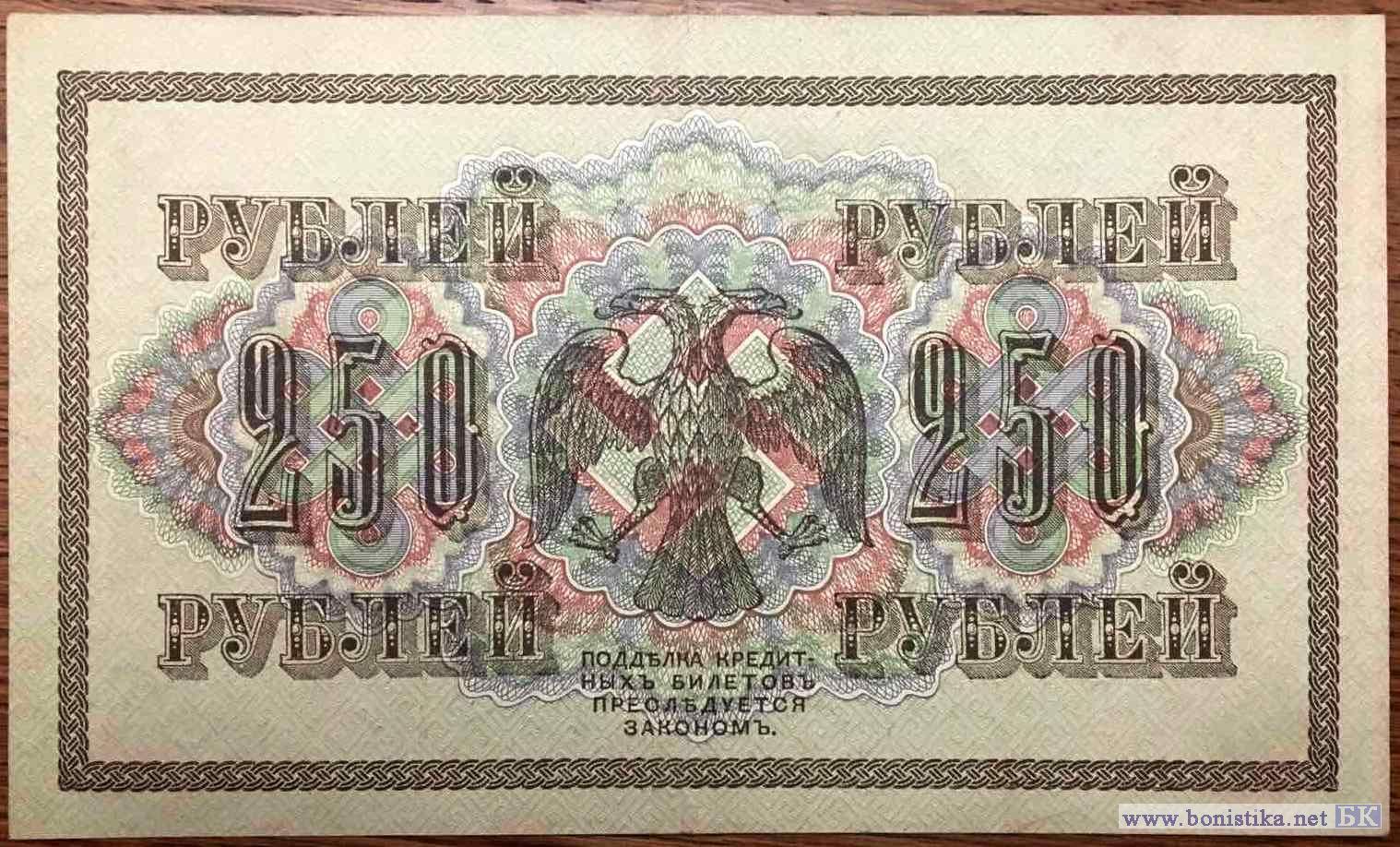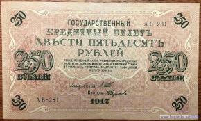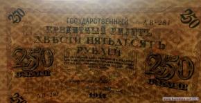 Государственный кредитный билет номиналом 250 рублей образца 1917 года. Согласно постановлению Временного правительства от 22 августа 1917 года, возглавляемого Керенским А. Ф.,