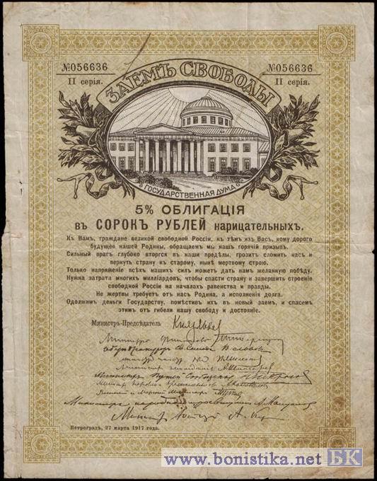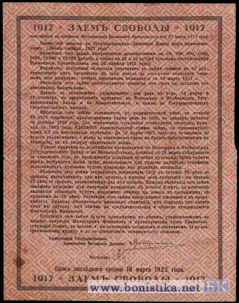 Облигация займа свободы номиналом 40 рублей с указанием "20 и 40 рублей".