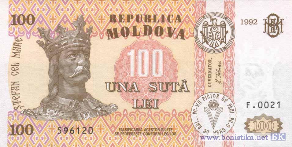 Аверс: Государственный герб Республики Молдова, надпись "REPUBLICA MOLDOVA", портрет Штефана чел Маре, многоцветный национальный орнамент, два вертикальных декоративных элемента, центральный гильош, номинальная стоимость в цифрах и буквах, художественно оформленная аббревиатура "BNM", факсимиле "GUVERNATOR, L. Talmaci", надпись по кругу "PE-UN PICIOR DE PLAI, PE-O GURA DE RAI...", стилизованное изображение литеры "V", год выпуска "1992", номер и серия банкноты, надпись "FALSIFICAREA ACESTOR BILETE SE PEDEPSEŞTE CONFORM LEGILOR".