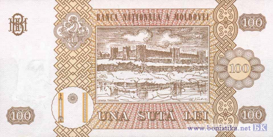 Реверс: Внутри рамы графическое изображение Крепости Тигина и надпись "CETATEA THIGHINA", номинальная стоимость в цифрах и буквах, два вертикальных декоративных элемента, герб Штефана чел Маре, стилизованное изображение колонны Трояна, Колонны Бесконечности и между ними полумесяц, название эмиссионного банка "BANCA NAŢIONALĂ A MOLDOVEI", художественно оформленная аббревиатура "BNM".