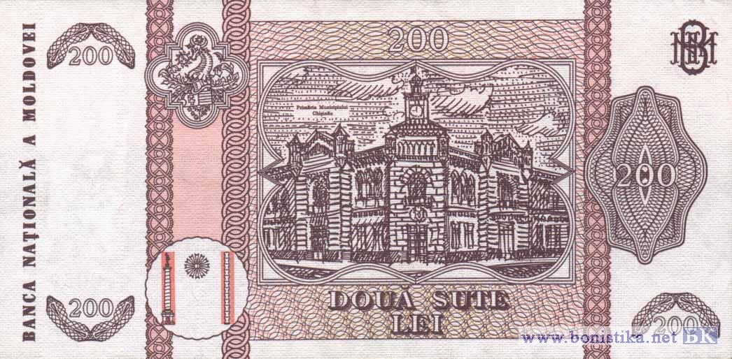 Реверс: Внутри рамы графическое изображение Мэрии Кишинэу и надпись "Primăria Municipiului Chişinău", номинальная стоимость в цифрах и буквах, три вертикальных декоративных элемента, герб Штефана чел Маре, стилизованное изображение колонны Трояна, Колонны Бесконечности и между ними полумесяц, название эмиссионного банка "BANCA NAŢIONALĂ A MOLDOVEI", художественно оформленная аббревиатура "BNM".