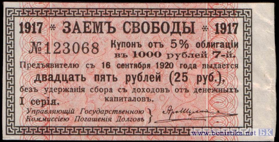 7-й купон от облигации Займа Свободы номиналом 1000 рублей.