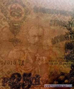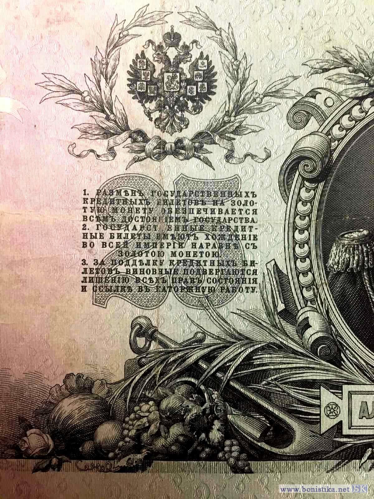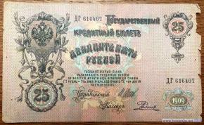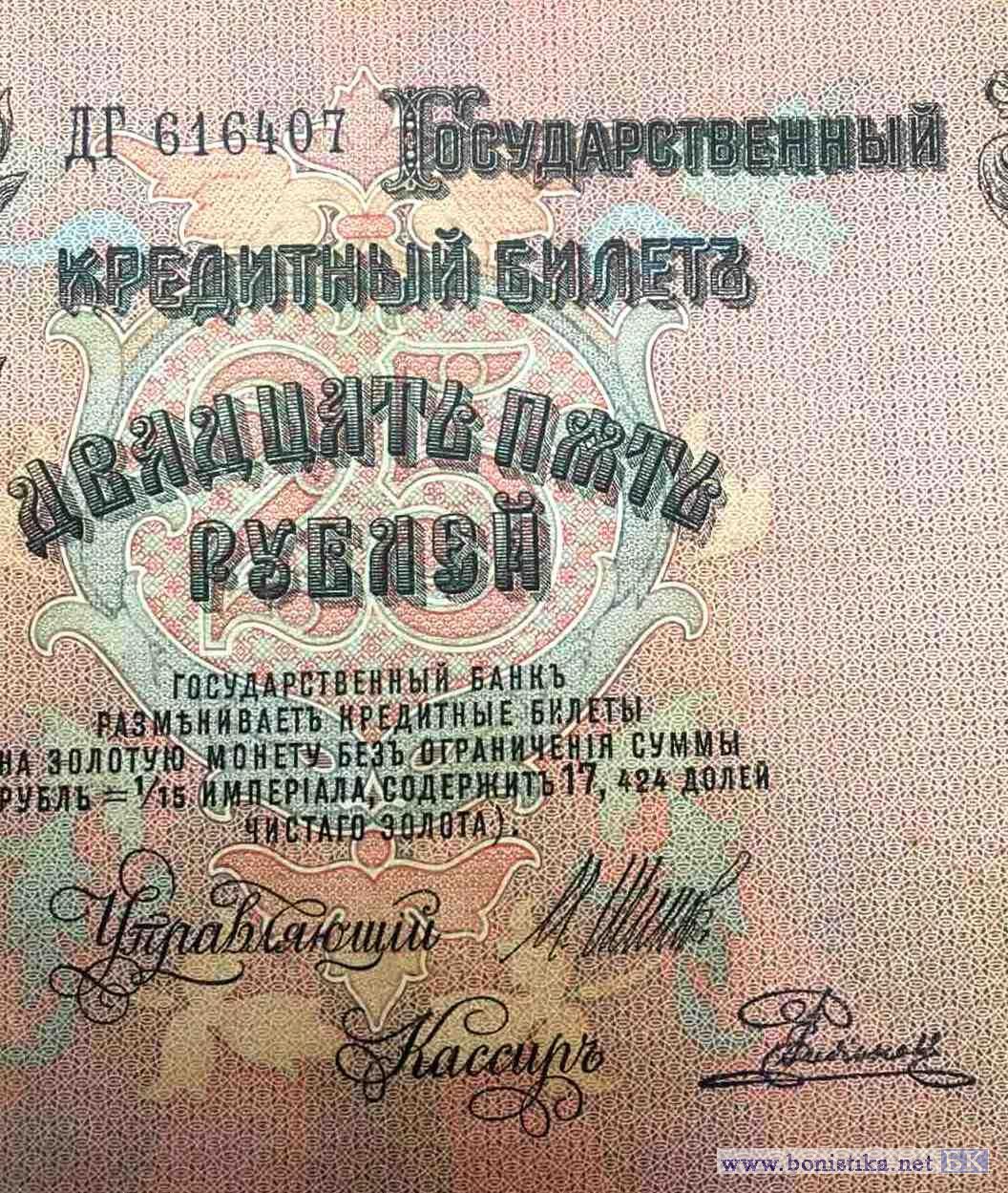 Государственный кредитный билет 25 рублей образца 1909. Автор (авторы) дизайна знака - Р.Г. Заррин. Л.с. Слева декоративный элемент из лавровых веток и лент. В центре герб Российской Империи образца 1883 года. Внизу цифры номинала - 25. Справа гильош с цифрами номинала. Внизу с годом - 1909. В центре текст - ГОСУДАРСТВЕННЫЙ КРЕДИТНЫЙ БИЛЕТ. ДВАДЦАТЬ ПЯТЬ РУБЛЕЙ. Государственный банк разменивает кредитные билеты на золотую монету без ограничения суммы (1 р. = 1/15 империала, содержит 17,424 долей чистого золота). Управляющий. Кассир. О.с. Справа портрет императора Александра III в овальной, с императорской короной, рамке. Внизу ветви, фрукты, якоря. Слева под императорской короной окно для водяного знака. В центре герб Российской Империи образца 1883 года с венком из лавровых ветвей. Ниже номинал - 25 и текст: 1. Размен государственных кредитных билетов на золотую монету обеспечивается всем достоянием государства.