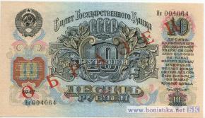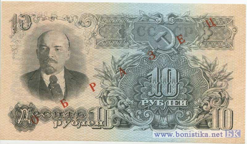 Ходили до реформы 1961 года. Всего было выпущено две разновидности купюр, отличающихся числом витков ленты в гербе СССР: у первого выпуска их было 16, у второго (1957 года) -15. Соответственно изменилось и число надписей "десять рублей" на языках союзных республик. Использовалось 2 типа шрифта (в шрифте было 25 букв).