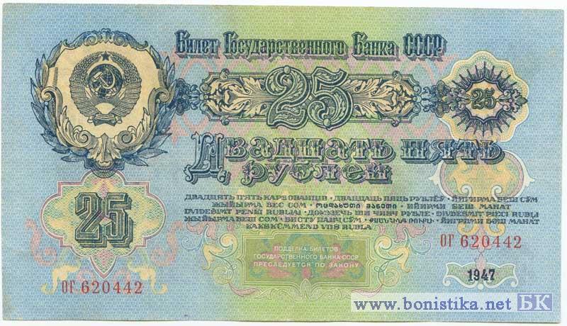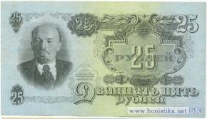 Ходили до реформы 1961 года. Всего было выпущено две разновидности купюр, отличающихся числом витков ленты в гербе СССР: у первого выпуска их было 16, у второго (1957 года) -15. Соответственно изменилось и число надписей "двадцать пять рублей" на языках союзных республик. Использовалось 2 типа шрифта (в шрифте было 25 букв).