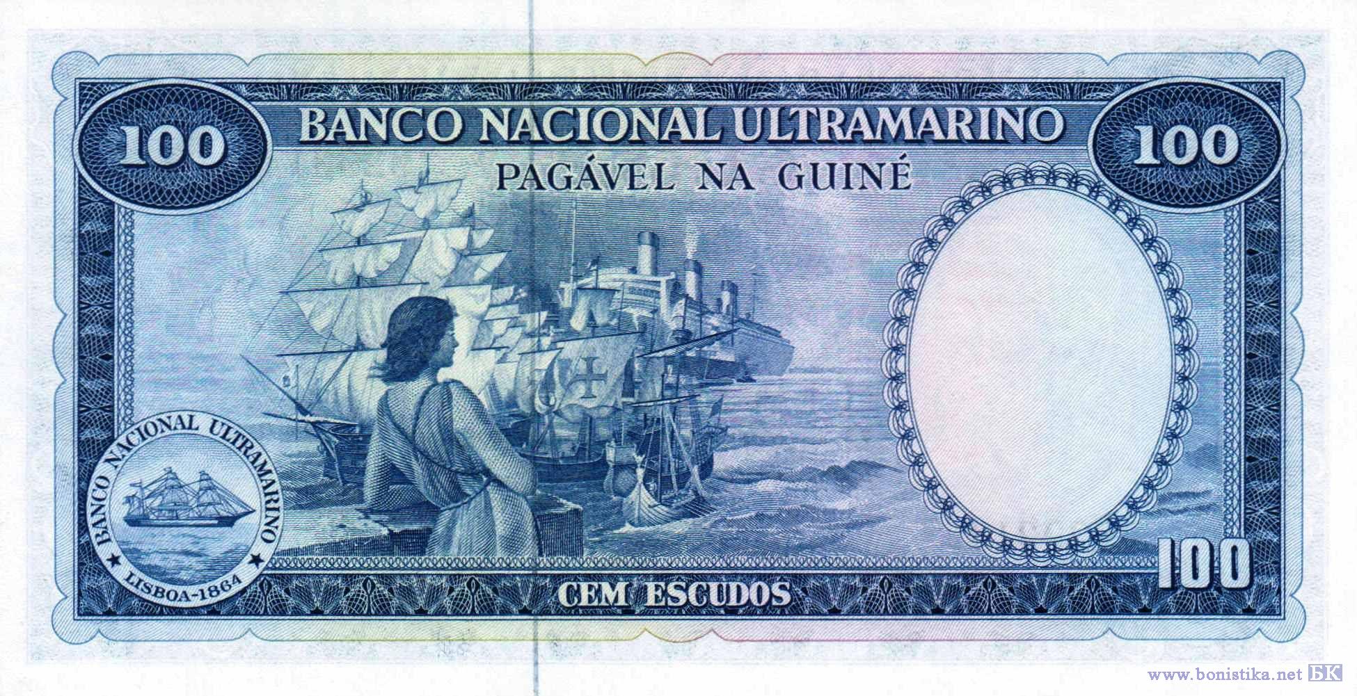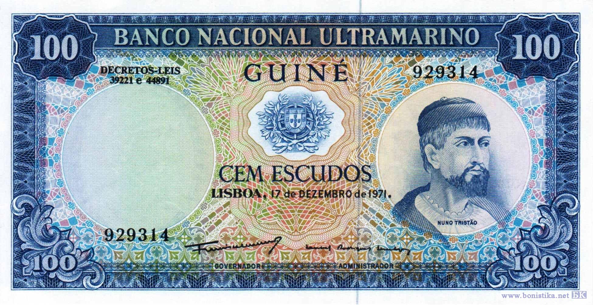 Герб Португалии, мореплаватель, первым из европейцев достигший побережья Гвинеи-Бисау, работорговец Нуну Триштан, убит во время 4-й экспедиции в Западную Африку при попытке захвата рабов в 1446 году. Эмблема Национального заморского банка, парусные суда, аллегорическая женская фигура, пароходы.