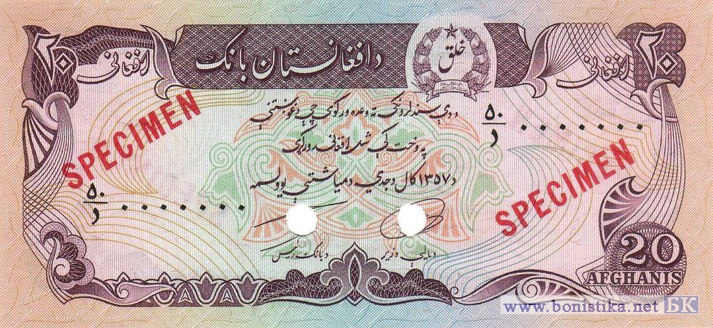 Образец. Герб Хальк. Подписи: Mohammad Hakim (глава Центробанка) и Abdul Karim Misaq (министр финансов). Не были выпущены в обращение из-за ввода советских войск в Афганистан.