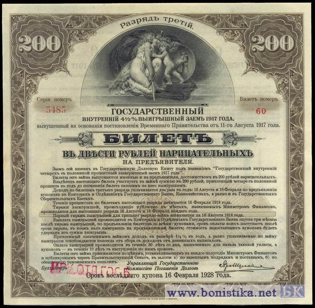 Государственный внутренний 4,5% выигрышный заем 1917 года. Разряд третий. Штамп Иркутского отделения государственного банка (цвет красный, буквы крупные).