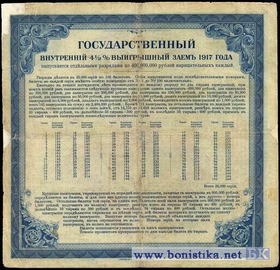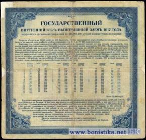Государственный внутренний 4,5% выигрышный заем 1917 года. Разряд четвертый. Надпечатка Сибирского ревкома 1920 года.
