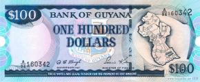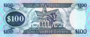 Эмблема банка, карта Гайаны с символами полезных ископаемых, производимого сырья и продуктов. Кафедральный собор Сент-Джордж в городе Джорджтаун, дерево.