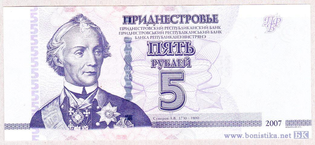 Вверху – надпись «ПРИДНЕСТРОВЬЕ», под надписью мелким шрифтом на трёх языках текст «ПРИДНЕСТРОВСКИЙ РЕСПУБЛИКАНСКИЙ БАНК». В центре – надпись «ПЯТЬ РУБЛЕЙ», ниже – цифровое обозначение номинала «5». Слева – вертикальный полосовой элемент в виде повторяющейся цифры «5», портрет А.В. Суворова в стиле ручной гравюры, правее над орнаментной полосой – надпись «Суворов А.В. 1730-1800». Справа вверху на чистом поле – логотип «ПРБ», внизу между орнаментными полосами – год образца банкноты «2007», под орнаментной полосой – мелкий текст «МОДИФИКАЦИЯ 2012 г.».