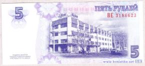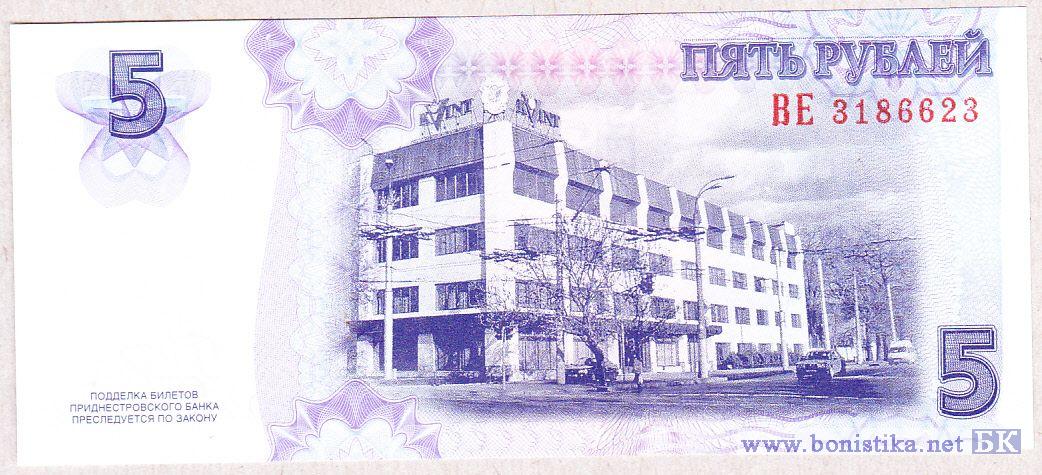 В центре – изображение административного здания завода «КВИНТ». Слева вверху – крупная цифра «5», внизу – текст «ПОДДЕЛКА БИЛЕТОВ ПРИДНЕСТРОВСКОГО БАНКА ПРЕСЛЕДУЕТСЯ ПО ЗАКОНУ». Справа вверху – надпись «ПЯТЬ РУБЛЕЙ», под ней – серия из двух заглавных букв и семизначный номер, внизу – крупная цифра «5».