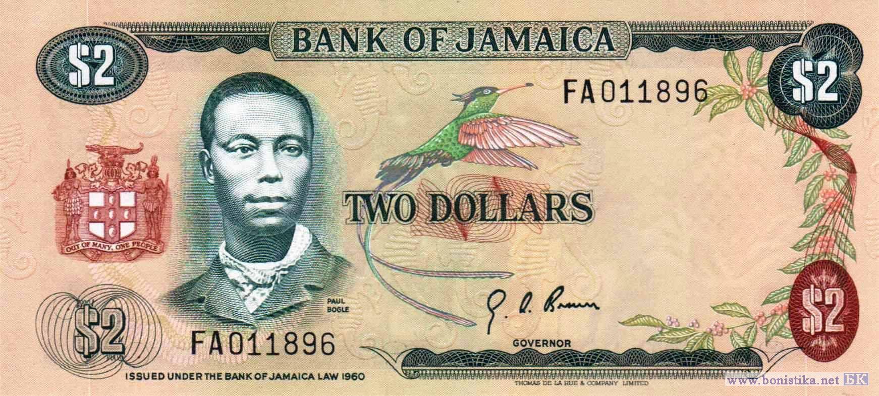 Национальный герой, руководитель негритянского восстания, священник Пол Богл, казнён британцами, самец вымпелохвостого колибри (Trochilus polytmus) – стрижеобразная птица семейства колибри, является эндемиком и национальной птицей Ямайки, ветви с листьями и плодами кофейного дерева арабского (Coffea arabica) – растения семейства мареновых. Ветви с листьями и плодами кофейного дерева арабского, фрагмент фотографии 1962 года с изображением группы учеников центрального филиала начальной школы в городе Кингстон, символизирующий единство людей разных рас населяющих Ямайку, геральдический девиз – «Из многих – единый народ».